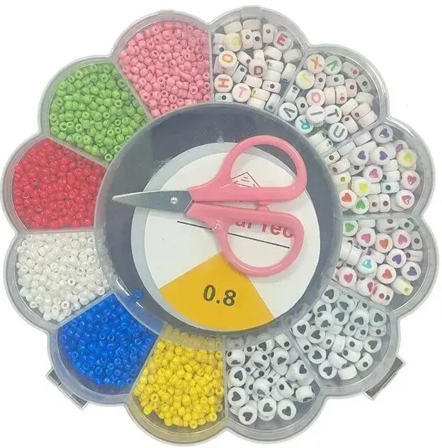 Бісер,намистини-англ.літери,ножиці,2 види,у пеналі(квітка),16х16х2см №610-02D-E(160)