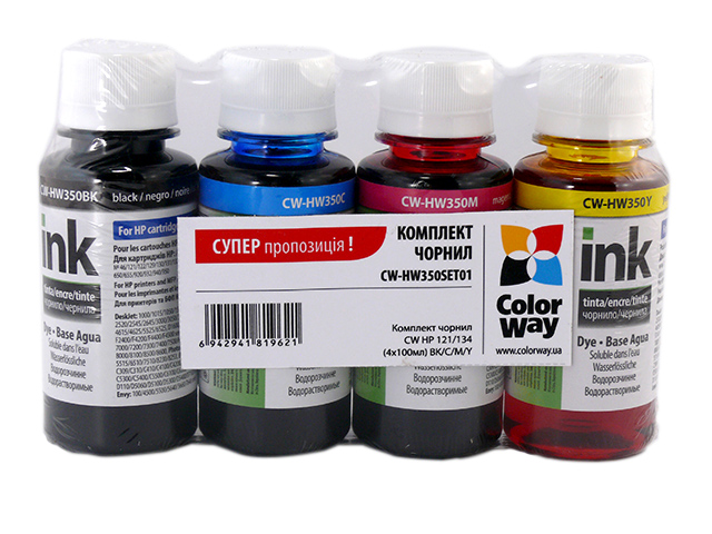Комплект чорнил ColorWay до HP HW350 BK/C/M/Y Dye-based 4 x 100 ml (CW-HW350SET01) Ккомплект чорнил ColorWay CW-HW350SET01 призначений для використання з принтерами HP. У комплекті містяться 4 пляшки чорнила по 100 мл кожна: чорний, синій, червоний та жовтий. Ці водорозчинні чорнила ColorWay забезпечать високу якість друку з яскравими та чіткими зображеннями. Сумісні принтери HP: Business InkJet: 1000, 1100, 1200, 2000, 2200, 2230, 2250, 2280, 2300, 2500, 2600, 2800 Color Copier: 210, 290, 310 DesignJet: 100, 110, 500, 70, 800, 815, 820 DeskJet: багато моделей від 1000 до 995 та ін. DeskJet Ink Advantage: багато моделей від 1015 до 5645 та ін. FAX: 1230 OfficeJet: багато моделей від 1175 до J6480 та ін. OfficeJet Pro: 1150, 1175, 8000, 8100, 8500, 8600, L7500, L7580 PhotoSmart: багато моделей від 1115 до P1218 та ін. PhotoSmart Pro: B8553 PSC: 500, 720, 750, 950 та інші. Цей комплект чорнил виготовлений для забезпечення вас відповідними кольорами для друку, забезпечуючи високу якість зображення.