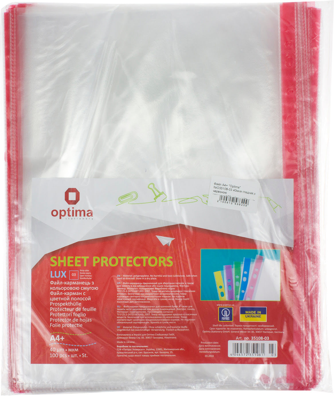 Файл А4+ "Optima" №O35108-03 40мкм гладкий,з червоною стрічкою(100шт/пач.)(20пач./ящ.)
