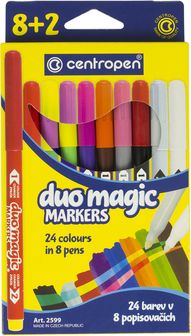 Фломастери з «магічним» чорнилом Duomagic. Чорнило змінює свій колір після промальовування поглиначами чорнила. Колір корпусу відповідає кольору чорнил, колір ковпачка - кольору після промальовування поглиначем №1, колір кришки корпусу - кольору після промальовування поглиначами чорнила №2. За допомогою 8 кольорів фломастерів і 2 поглиначів чорнила можна створити 24 кольори. Круглий пишучий вузол. Ширина сліду 2,5 мм. Пишучий вузол витримує велике навантаження без деформації. Вентильований ковпачок. Корпус з поліпропілену. Ергономічна форма зони захоплення зменшує напругу м'язів пальців. Не висихає без ковпачка протягом 10 днів. У наборі: 8 фломастерів і 2 види поглинача чорнила. Упаковка - пластиковий пенал з еврозавісом. Термін зберігання - 2 роки.