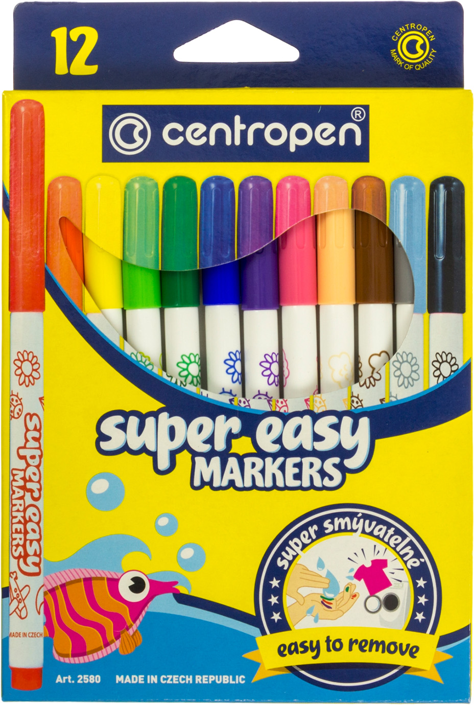 Дитячі фломастери SUPER EASY. Чорнило з легкістю видаляється зі шкіри звичайною водою або навіть вологою серветкою. Чорнило на водній основі легко відпирається. Ергономічна форма зони захоплення зменшує напругу м'язів пальців. Круглий пишучий вузол. Ширина сліду 1-3 мм. Пишучий вузол витримує велике навантаження без деформації. Вентильований ковпачок. Не висихає без ковпачка протягом 10 днів. Картонна упаковка з еврозавісом.