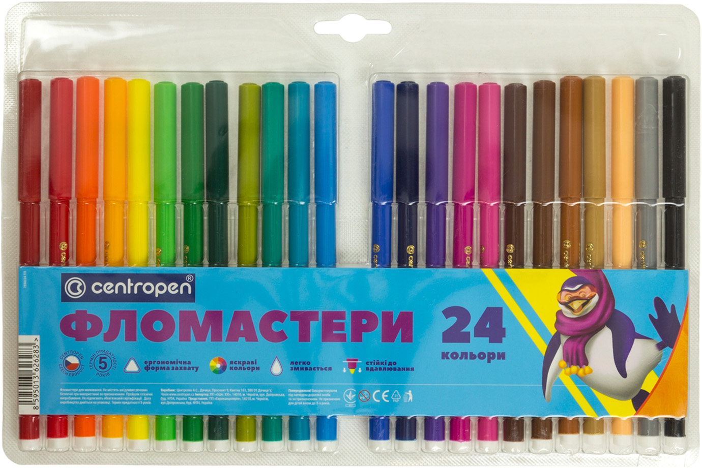Фломастери з чорнилом, що легко відпирається, на водній основі. Яскраві і насичені кольори. Легко змивається з рук і відпирається з одягу. Чорнило безпечне для здоров'я. Круглий пишучий вузол. Ширина сліду 1-2 мм. Пишучий вузол витримує велике навантаження без деформації. Ергономічна форма зони захоплення зменшує напруження м'язів пальців. Вентильований ковпачок. Корпус з поліпропілену. Упаковка з еврозавісом. Термін зберігання - 5 років.