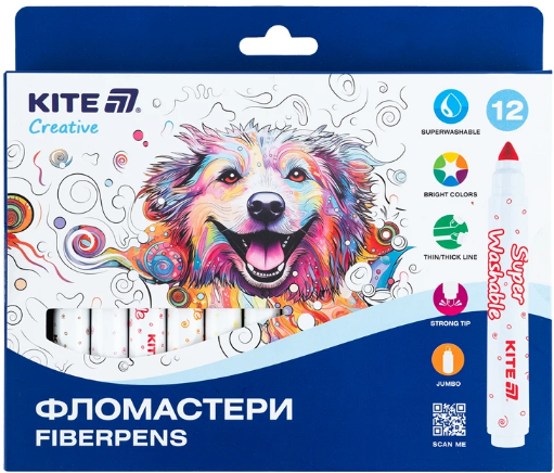 Фломастери Kite Creative: • набір із 12 фломастерів формату Jumbo; • суперзмивні чорнила, які легко змиваються водою; • товстий пишучий вузол, зручний для дітей; • міцний пишучий вузол, що не провалюється при натисканні; • компактна упаковка для зручного зберігання та транспортування.