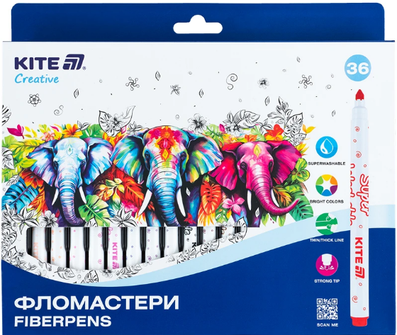 Фломастери Kite Creative: • набір із 36 фломастерів; • конусоподібний пишучий вузол для тонких та широких ліній; • суперзмивні чорнила, які легко змиваються водою; • надійно закріплений пишучий вузол для зручного малювання різних елементів; • зручна слайдер-упаковка для легкого зберігання та транспортування.