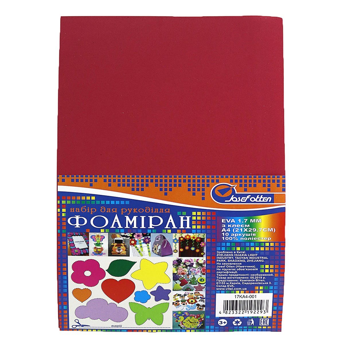 Фоаміран А4 темно-червоний,товщина 1,7мм EVA,клейкий №17KA4-001(10)