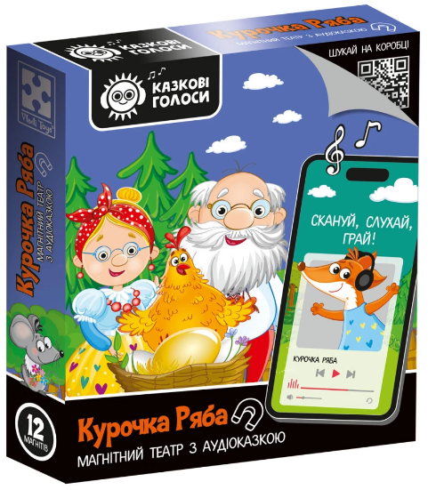 Розвиваюча гра у вигляді магнітного театра з бонусом - аудіоказкою "Курочка Ряба". Серія “Казкові голоси” у коробці містить магнітних персонажів і декорації з полем для гри. Звільняємо коробку серії “Казкові голоси” від захисної плівки. Зворотний бік коробки має в своєму конструктиві горизонтальну, відривну стрічку, яка виділена перфорацією. Видаліть захисну, відривну стрічку, потягнувши її праворуч. Таким чином, відкриється площина з QR-кодом в навушниках. Скануйте код, переходьте за посиланням на вебсторінку з аудіоказкою "Курочка Ряба". Під картинкою з персонажами зліва натисніть значок play, що відтворить аудіоказку. Можна ставити на паузу і регулювати звук. З магнітними персонажами дитина може влаштувати гру-виставу під аудіоказку на магнітній поверхні (магнітна дошка, поверхня холодильника). Комплектація: 12 магнітів, поле для гри 16x24 см. Вік: 3-6 років. Розмір коробки: 160 x 35 x 185 мм.