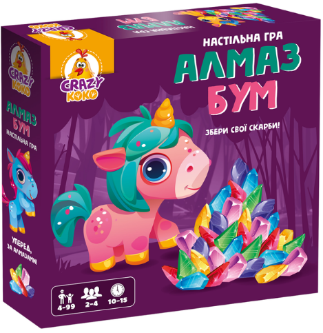 Дитина грає в цікаву гру у пошуках алмазів та виконує різноманітні завдання. Комплектація: 4 фігурки єдиноріжок та пластикові підставки для них, 10 деталей поля, 1 гральний кубік, 20 алмазів, правила гри. Особливості: різноманітний набір алмазів та ігрових елементів. Мова: українська. Вік: 4-99 років.