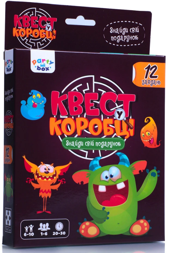 Гра-квест «Монстри» містить 12 карток з завданнями, виконуючи які дитина наближається до головного призу – подарунка, що підготували батьки. Подарунок не входить в комплектацію.