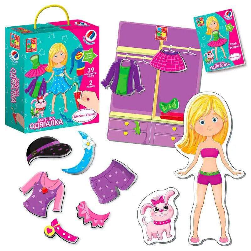 Магнітна одягалка Vladi Toys. Меган і Поллі VT3702-11. Особливості: у грі 2 персонажі та набір магнітних елементів одягу. У модному журналі представлені основні моделі та безліч ігор і головоломок. Набір містить: 2 ляльки, 39 магнітних елементів одягу, шафа для одягу, модний журнал. Мова: українська. Вік: 3-6 років.