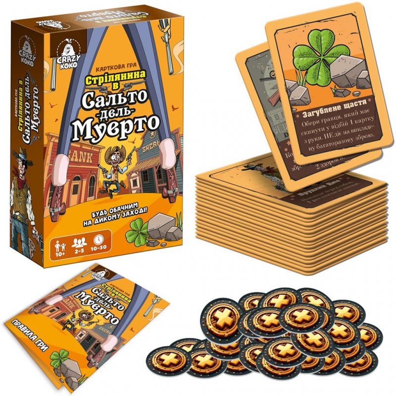 Небайдужі до Дикого Західу? Занурьтесь в атмосферну карткову гру Vladi Toys "Стрілянина в Сальто-дель-Муерто”. Суворі судді, щасливі долари, чотирилисники конюшини, арбалети, мушкети і ще багато вражаючих карток. Цікаві правила і жвавий хід гри розрахований на 2-5 гравців тривалістю від 10 до 30 хвилин. Комплектація: 50 карток, 50 жетонів здоров'я, правила гри. Вік: 10+.