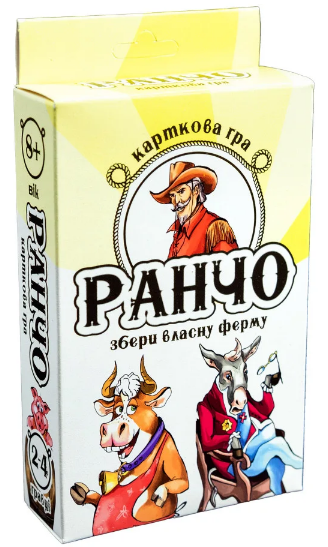 «Ранчо» – карткова гра для дітей, яка буде цікава всій родині. Задачею гравців є зібрати картки з різними домашніми тваринами, вміло обмінюючи їх на «ринку». В обміні беруть участь тільки картки домашніх тварин, а їхня «ціна» визначається балами на зображеннях. Щоб взяти картку з «ринку» натомість потрібно з рук викласти картки, у яких сума або різниця балів дорівнює балам на картці з «ринку». І виграє той, хто до кінця гри збере найбільше ранчо. «Ранчо» вдало поєднує навчання з веселощами, адже граючи діти швидше починають розуміти, як додавати і віднімати числа в умі. Вік: 8+ Гравців: 2-6 Комплектація: 72 картки, інструкція.