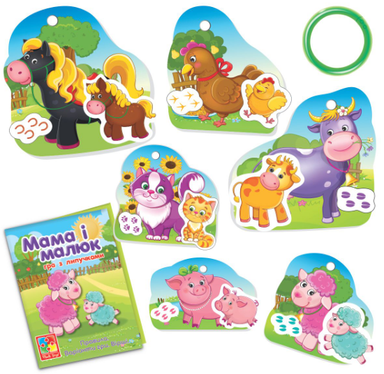 Перша гра з липучками для малюків. Добрі тварини дають малюкові розуміння важливої теми "Мама і малюк", допомагають визначати де чиї сліди і просто весело провести час. Гра зручна і цікава. Тварин можна закріпити на кільці і взяти з собою на прогулянку. Комплектація: картонні деталі – 24 шт., жовті липучки – 18 шт., прозорі липучки – 18 шт., пластикове кільце, правила. Вік: 3-5 років.