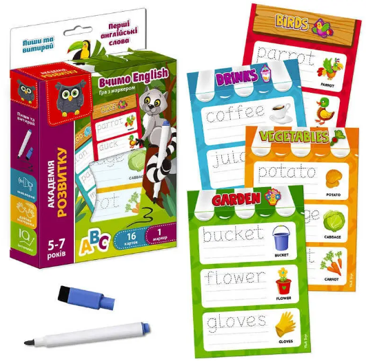 Виконуємо завдання на картках за допомогою спеціального маркера, що стирається. Вивчаємо англійські слова. Особливості: міцний картон, двосторонні картки, маркер "Пиши-витирай". Комплектація: 16 карток, маркер із губкою. Розмір коробки: 215 х 45 х 30 мм. Мова українська. Вік: 5-7 років.