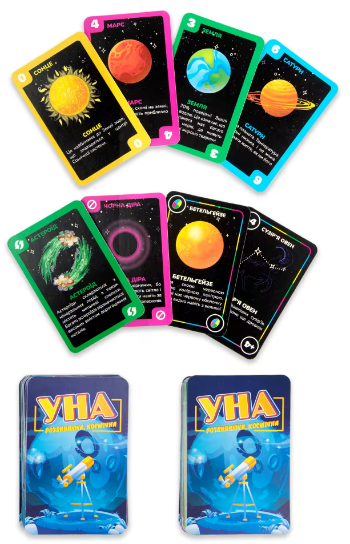 Настільна гра «Уна космічна» Вага: 153 г Розміри: 13,7х8,7х1,8 Артикул: 30448 Комплектація: коробка, гральні картки – 108 шт. Настільна гра «Уна космічна» - оновлений варіант всім відомої класичної гри «UNO». Однак є приємний бонус: на картках ви знайдете цікаву інформацію про планети, зірки та астероїди. Це дозволить вам не тільки весело провести час, але й отримати нові знання. Гра «Уна космічна» розважить вас у приємній компанії, а також допоможе поринути у світ космічних пригод!