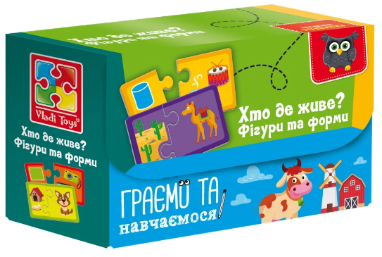 Пазли "Знайди пару. Хто де живе? На що схоже?" Vladi Toys. Особливості: коробка на липучках, цупкий картон. Комплектація: 21 пазл, закладка для книги. Мова: українська. Вік: 4-6 років.