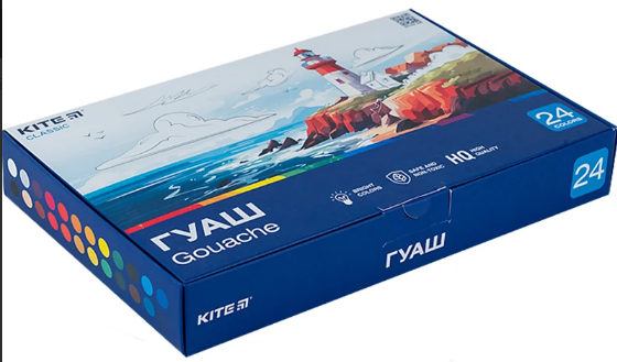 Гуаш Kite містить 24 кольорів. Баночки по 20 мл зберігаються в картонній упаковці. Кольори яскраві і насичені, легко змішуються. Фарби приємної однорідної текстури, рівномірно наносяться на поверхню. Змиваються зі шкіри та інших поверхонь мильною водою. Фарби сприяють емоційному та мовному розвитку дитини, а також сприйняттю кольорів. Дитина навчиться змішувати фарби і створювати нові кольори. Дитячі фарби нейтрального запаху. Фарби виготовлені з натуральних компонентів з додаванням консервантів, не містять шкідливих речовин. Рекомендовано дітям дошкільного та шкільного віку.