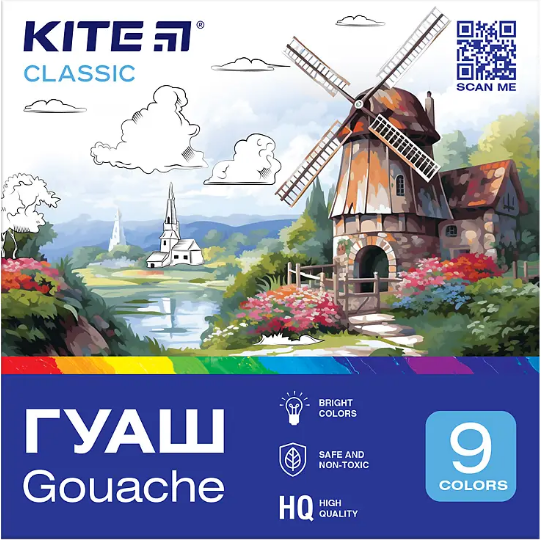 Гуаш Kite містить 9 кольорів. Баночки по 20 мл зберігаються в картонній упаковці. Кольори яскраві і насичені, легко змішуються. Фарби приємної однорідної текстури, рівномірно наносяться на поверхню. Змиваються зі шкіри та інших поверхонь мильною водою. Фарби сприяють емоційному та мовному розвитку дитини, а також сприйняттю кольорів. Дитина навчиться змішувати фарби і створювати нові кольори. Дитячі фарби нейтрального запаху. Фарби виготовлені з натуральних компонентів з додаванням консервантів, не містять шкідливих речовин. Рекомендовано дітям дошкільного та шкільного віку.