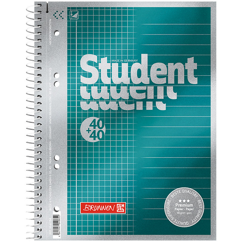 Коледж-блок BRUNNEN Premium А5 формату на спіралі виготовлений з європейського високоякісного білого паперу 90 г/м2. 40 аркушів у клітинку та 40 аркушів у лінійку. Папір стійкий до чорнила. Сторінки мають мікроперфорацію для легкого відривання та додаткову перфорацію на 6 отворів для кріплення у папках. Колір: блакитний металік