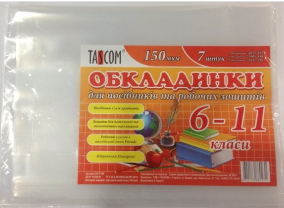 Комплект обклад. для посібників та роб. зошит. 6-11кл 150мкм 7шт №2512-ТМ/Tascom/(30)