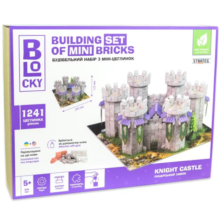Будівельний набір з міні-цеглинок BLOCKY "Лицарський замок" Артикул: 31005 Вага: 1520 г. (+/-50 г). Розміри пакування: 35,5х27х7 см. Комплектація: коробка (виготовлена з картону), цеглинки - 1241 шт. (виготовлені з гіпсу, води та барвника), клей ПВА, пензлик, комплект додаткових елементів (виготовлений з картону), інструкція (виготовлена за паперу). Великий набір для творчості з маленьких цеглинок, з яких ви зможете побудувати настільний, дуже автентичний середньовічний лицарський замок. Шість круглих веж та понад 1200 цеглинок - це буде дійсно велика справа, але результат вас залишить вас задоволеними. А якщо ні - будівлю можна розібрати та спробувати ще раз. Подаруйте дитині або собі можливість доторкнутися до праці справжнього будівника у реальному світі, а не лише в "Майнкрафті"! Рекомендований вік: від 5 років. Англійською та українською мовами.