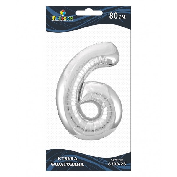 Кулька повітр. фольгована "Цифра-6" 80см срібло №830826/Pelican/(1)(10)(20)