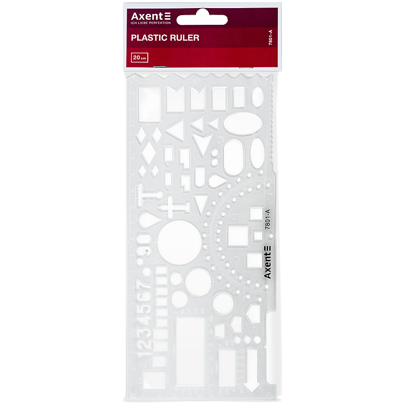 Лінійка-трафарет «Офіцерська» Axent 7801-A має довжину 20 см. Пластикова лінійка призначена для креслення та оформлення робіт з геометричними фігурами, знаками, цифрами, транспортиром тощо. Індивідуальна блістерна упаковка.