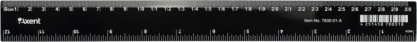 Пластикова чорна лінійка 30 см має 2 шкали виміру : сантиметрову та дюймову. Індивідуальна блістерна упаковка.