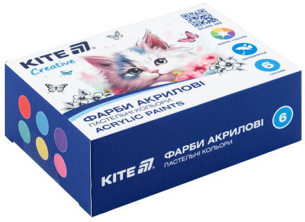 Пастельні акрилові фарби Kite Creative K-271, 6 кольорів, кожна баночка по 20мл. Фарби ідеально підходять для роботи на різних поверхнях: папері, тканині, кераміці, склі, металі, камені, дереві та пластику. Після висихання фарби стають водостійкими та зберігають насиченість навіть при тривалому впливі світла. Безпечні для дітей — нейтральний аромат і нетоксичні компоненти у складі.