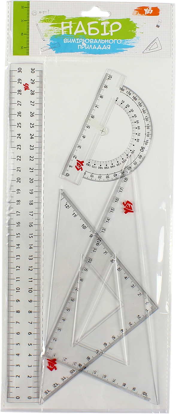 Набір лінійок ТМ Yes складається із незамінних інструментів для точних вимірювань та чітких ліній. Виготовлені з високоякісних матеріалів, вони забезпечують тривалу службу без пошкоджень. Набір торгової марки Yes призначений для створення креслень, побудов, малюнків, вимірювання лінійних розмірів, відстаней. Характеристики: - склад набору: лінійка 30 см, транспортир 180° , трикутник рівнобедрений 13х13 см, трикутник прямокутний 18х10 см. - підходить для лівші та правші; - матеріал: пластик; - прозорий корпус. Лінійки бренду Yes можна доповнити трендовими канцелярськими товарами з однойменної колекції.