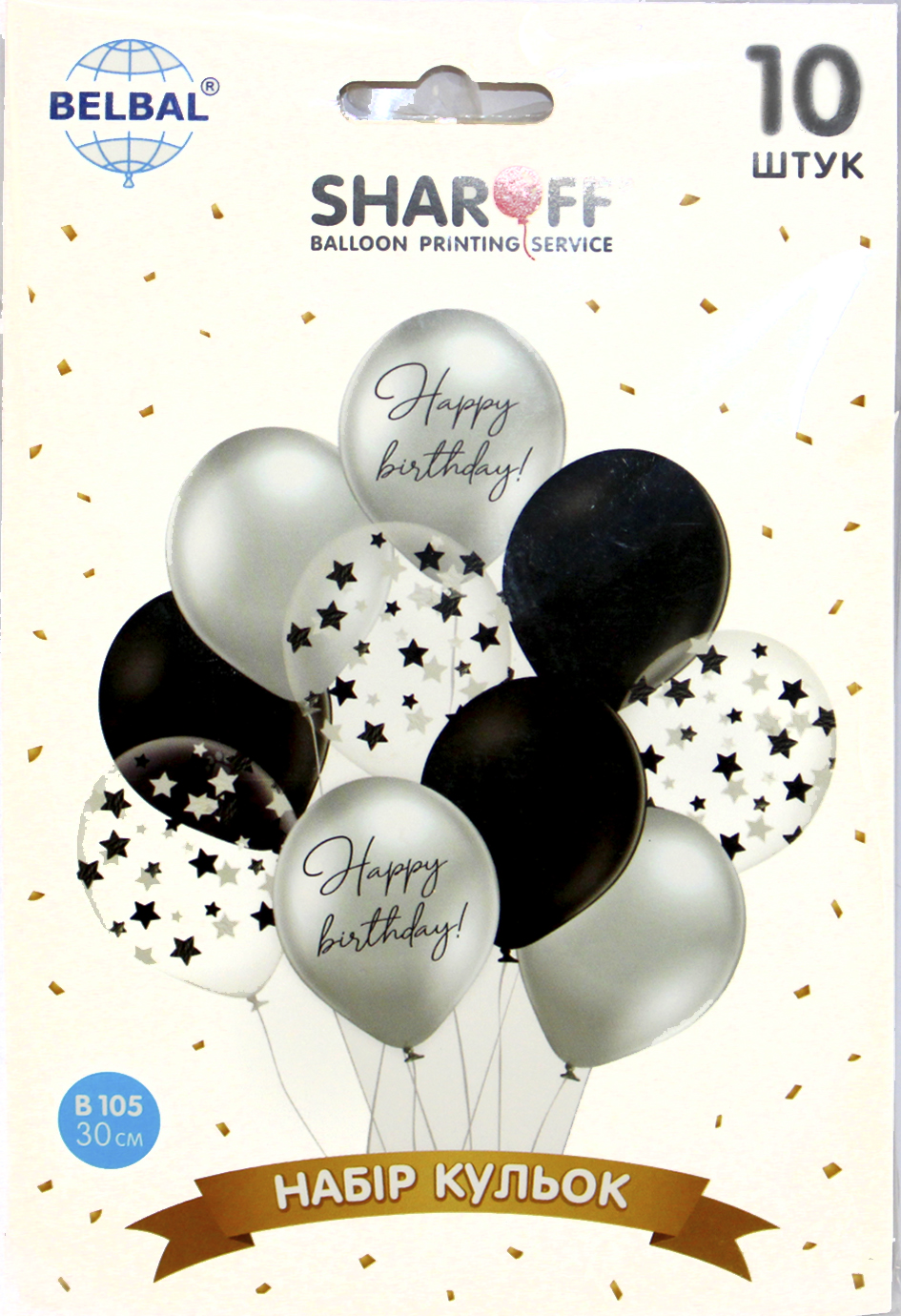 Набір кульок повітр. латексних 12"/30см "Happy Birthday" срібло з чорним 10шт/Sharoff/