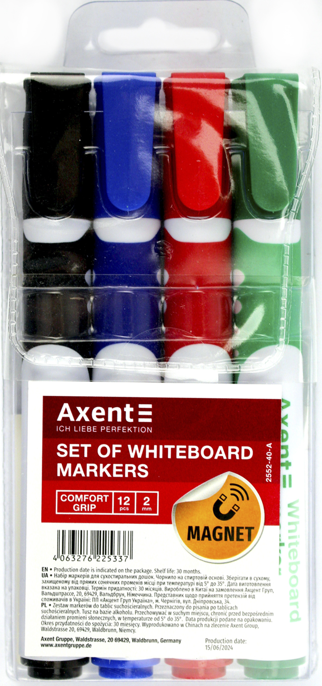 Набір маркерів "Axent" №2552-40 Whiteboard Comfort Grip 4 кольор.(12)