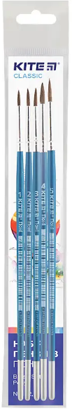 З набором пензлів Kite Classic K-345 дитина, напевно, буде з легкістю втілювати свої творчі задумки і фантазії на папері. Пензлі призначені для малювання водорозчинною фарбою - аквареллю, гуашшю або темперою. Виріб має безшовну ручку, зроблену з березової деревини, та обрамлену алюмінієвою обоймою. Щетина виготовлена з тонкого волоса поні, вона тримає первісну форму і гарно вбирає фарбу. Набір міститься в полібезі і складається з 5 круглих пензлів різних розмірів - 1, 2, 3, 4 і 5. Це допоможе дитині не тільки акуратно промальовувати деталі і контури, але і розфарбувати фон.