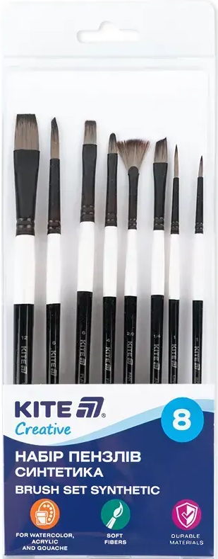 Набір із 8-ми пензлів синтетика Kite Creative. Алюмінієва обойма, синтетичний ворс, дерев'яна ручка. Упаковка - пластиковий пенал. Розміри пензлів у наборі: 6,1,1- круглі, 2/0 -віялоподібний, 1/4 -скошений, 12,6,4 - пласкі