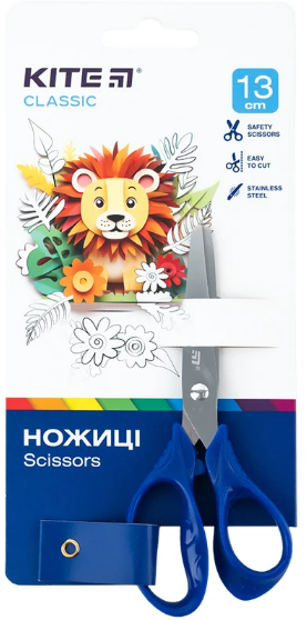Ножиці Kite Classic. Ручки зроблені з первинного пластику, вони термостійкі та стійкі до механічних пошкоджень. Форма ручок зручна для багатогодинного використання. Леза зроблені з нержавіючої сталі, вони досить гострі для розрізання паперу, картону, тканини та ниток. Навіть при легкому натисканні дитина відріже щільний картон. Кінчики дитячих ножиць мають заокруглену форму з метою безпеки. Довжина виробу в 13 см дозволяє з легкістю зберігати ножиці у пеналі або у невеликій кишені. Рекомендовано дітям дошкільного та шкільного віку.
