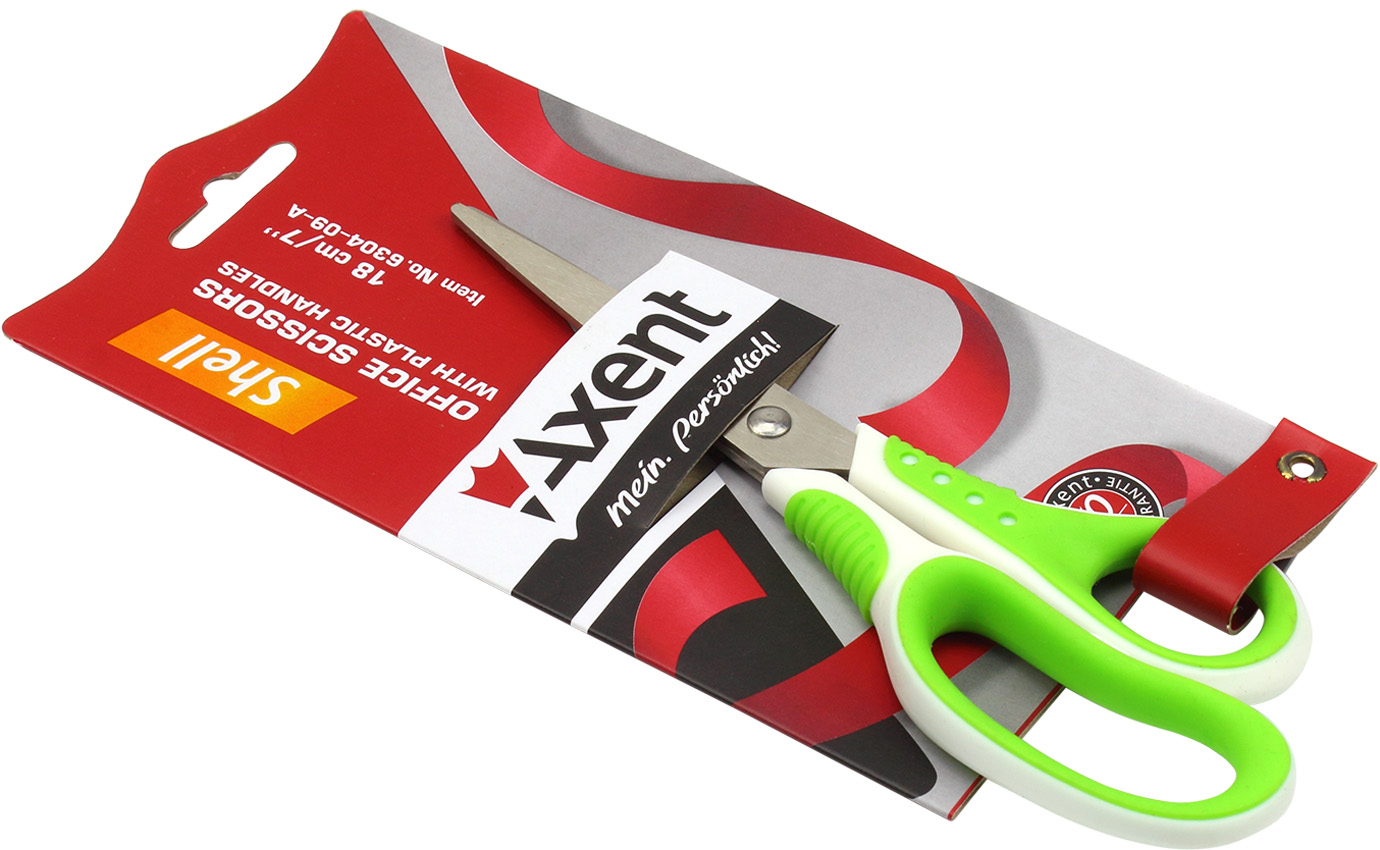 Офісні ножиці з пластиковими ручками - використовуються для різання паперу, картону, тканини та ін. Якісні матеріали та збірка, продумані деталі офісних ножиць Axent забезпечують комфортну, безпечну роботу і довговічність. Леза - з високоякісної сталі, міцні і стійкі до корозії, не потребують додаткового заточування. Кінчики лез закруглені для безпечної роботи. Леза щільно прилягають один до одного, забезпечують плавний і м'який хід. Папір розрізається легко і без зминання. Рукоятки з міцного пластику, стійкі до навантажень. Особливість ножиць серії Axent Shell - асиметричні кільця ергономічної форми з гумовими вставками, що запобігають ковзанню пальців, забезпечують зручність і комфорт у використанні, а також стильне і легке поєднання кольорів (білий з яскравим кольором).