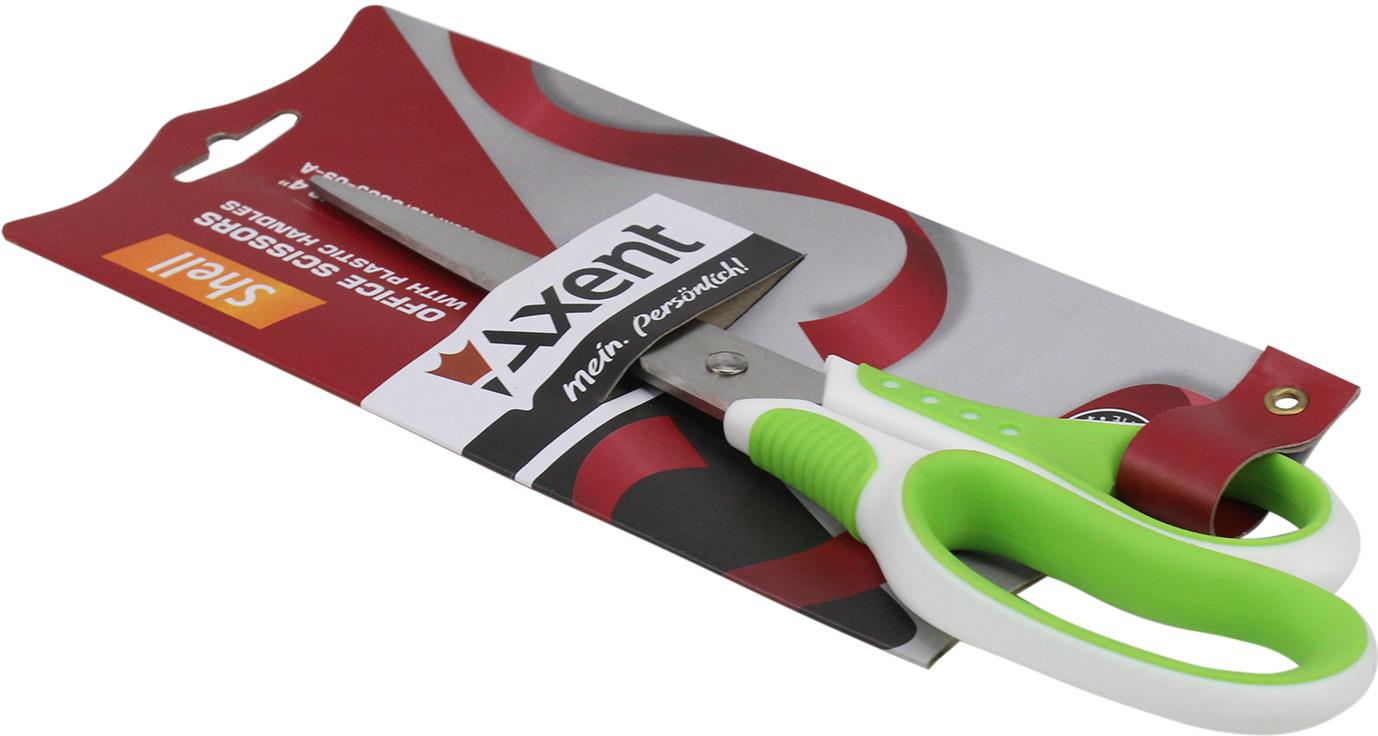 Офісні ножиці з пластиковими ручками - використовуються для різання паперу, картону, тканини та ін. Якісні матеріали та збірка, продумані деталі офісних ножиць Axent забезпечують комфортну, безпечну роботу і довговічність. Леза - з високоякісної сталі, міцні і стійкі до корозії, не потребують додаткового заточування. Кінчики лез закруглені для безпечної роботи. Леза щільно прилягають один до одного, забезпечують плавний і м'який хід. Папір розрізається легко і без зминання. Рукоятки з міцного пластику, стійкі до навантажень. Особливість ножиць серії Axent Shell - асиметричні кільця ергономічної форми з гумовими вставками, що запобігають ковзанню пальців, забезпечують зручність і комфорт у використанні, а також стильне і легке поєднання кольорів (білий з яскравим кольором).