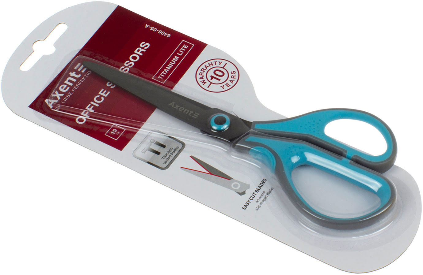 Офісні ножиці з пластиковими ручками ергономічної форми Axent Titanium Lite. Використовуються для різання паперу, картону, тканини та ін. Якісні матеріали та збірка, продумані деталі ножиць забезпечують комфортну, безпечну роботу і довговічність. Особливість ножиць серії Axent Titanium Lite - особлива форма лез, виготовлених з високоякісної сталі та вкриті покриттям Gun Black Titanium, що робить їх ще більш міцнішми, зносостійкими, та прослужать довше. Особлива заточка лез робить їх в три рази гостріше аналогів, а їх кінчики закруглені для безпечної роботи. Леза щільно прилягають один до одного, забезпечують плавний і м'який хід. Папір розрізається легко і без зминання. Ручки виготовлені за технологією подвійного лиття, що робить їх міцними та надійними. Зручність і комфорт у використанні, стильний дизайн. Упаковка - блістер.