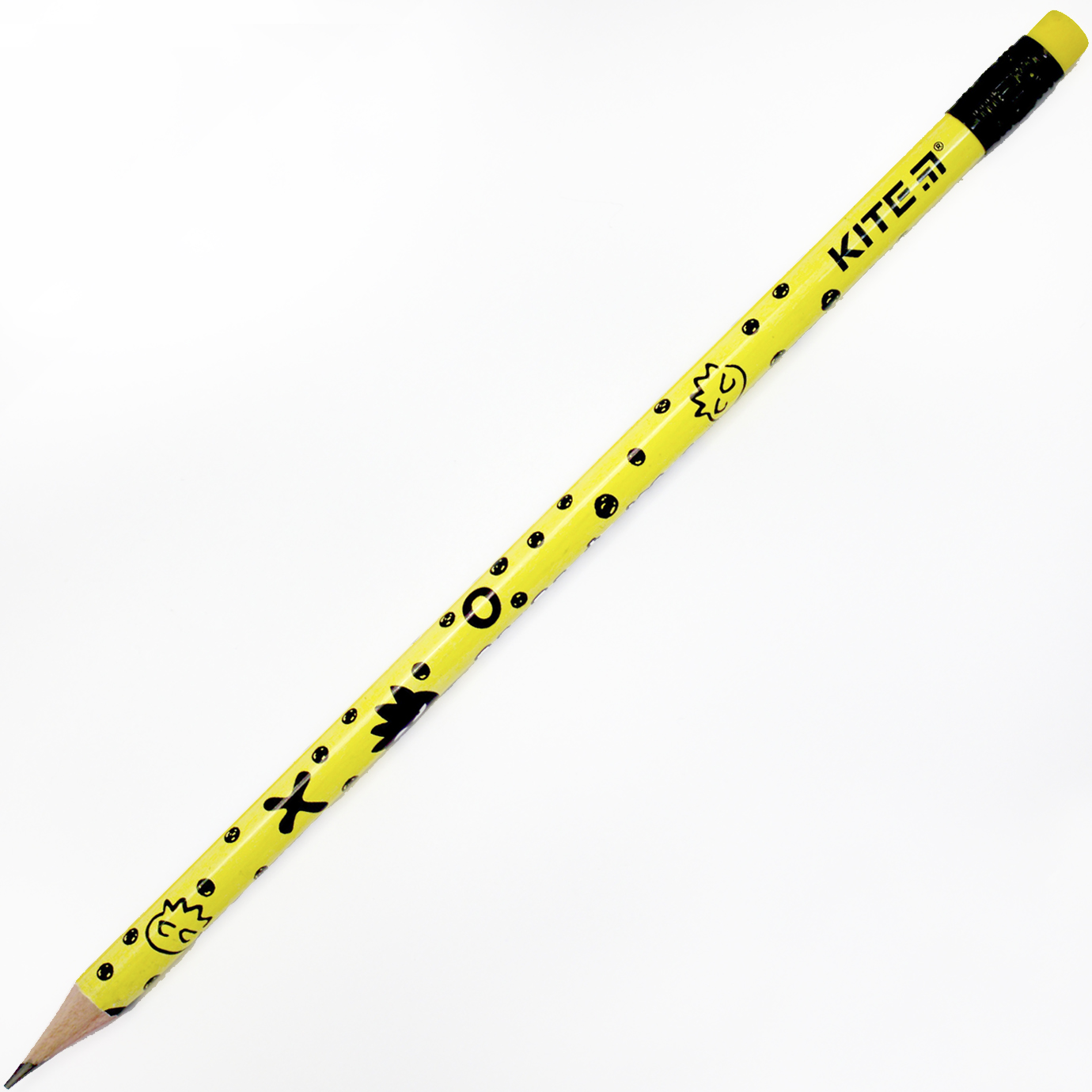 Олівець графітний Kite, з гумкою. Твердість НВ. Товщину лінії легко регулювати за допомогою натиску. М'який грифель не кришиться і не дряпає папір. При заточуванні або падінні олівець не ламається. Корпус олівця покритий малюнком. Лакове покриття корпусу запобігає розсиханню і появі тріщин. Олівець Kite незамінний для школярів і студентів.
