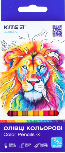 Кольорові двосторонні олівці Kite в картонній упаковці. Дванадцять олівців мають 24-кольорову палітру, їх компактно зберігати в пеналі і рюкзаку дитини. Дитячі олівці малюють м'яко, при легкому натисканні дитина легко отримає яскраву картинку. Грифель товщиною в 3 мм малює плавно, не кришиться і не дряпає папір. Олівці при заточуванні або падінні не ламаються і не кришаться. Кольорові олівці виготовлені з міцної натуральної деревини. Олівці покриті лаком в тон кольору грифеля, який запобігає розсиханню і появі тріщин на корпусі. Довжина виробу 175 мм. Набір олівців Kite рекомендований для дошкільнят і школярів.