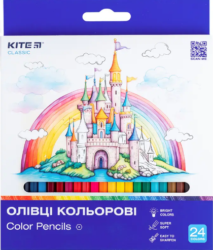 Кольорові шестигранні олівці Kite в картонній упаковці. Двадцять чотири олівці мають гармонічну палітру, їх компактно зберігати в пеналі і рюкзаку дитини. Дитячі олівці малюють м'яко, при легкому натисканні дитина легко отримає яскраву картинку. Грифель товщиною в 3 мм малює плавно, не кришиться і не дряпає папір. Олівці при заточуванні або падінні не ламаються і не кришаться. Кольорові олівці виготовлені з міцної натуральної деревини. Олівці покриті лаком в тон кольору грифеля, який запобігає розсиханню і появі тріщин на корпусі. Довжина виробу 175 мм. Набір олівців Kite рекомендований для дошкільнят і школярів.