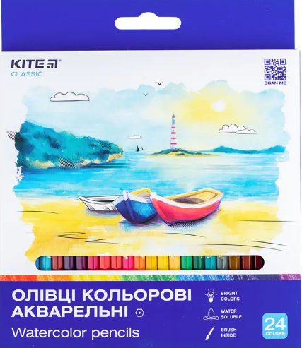 Кольорові акварельні олівці Kite в картонній упаковці з пензликом. Двадцять чотири олівці мають гармонічну палітру, їх компактно зберігати в пеналі і рюкзаку дитини. Акварельні олівці поєднують властивості акварельної фарби і кольорового олівця. По малюнку, виконаному акварельними олівцями, досить провести мокрим пензлем і ми отримаємо справжній акварельний малюнок. Дитячі олівці малюють м'яко, при легкому натисканні дитина легко отримає яскраву картинку. Грифель товщиною в 3 мм малює плавно, не кришиться і не дряпає папір. Олівці при заточуванні або падінні не ламаються і не кришаться. Кольорові олівці виготовлені з міцної натуральної деревини. Олівці покриті лаком в тон кольору грифеля, який запобігає розсиханню і появі тріщин на корпусі. Довжина виробу 175 мм. Набір олівців Kite рекомендований для дошкільнят і школярів.