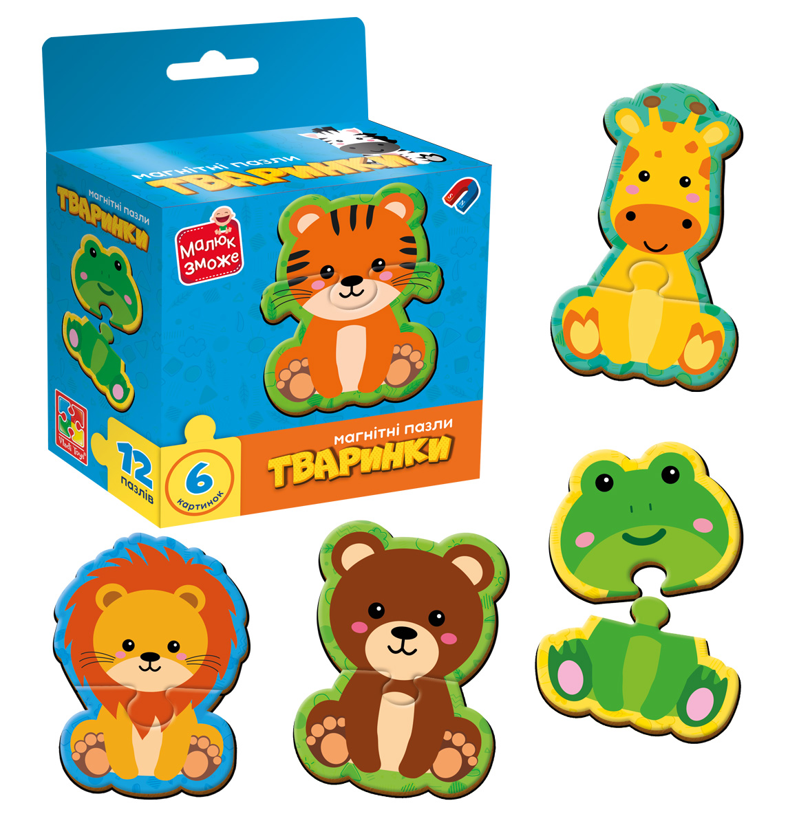 Гра розвиваюча Vladi Toys пазли магнітні "Тваринки" з серії “Малюк зможе” поставляється в компактній блакитній коробці з підвісом. Усередині коробки 12 пазлових частин, з яких малюку потрібно зібрати 6 різних екзотичних і не дуже тваринок: тигр, зебра, ведмідь, лев, жирафа, жаба . Кріпити і збирати можна на будь-якій металевій поверхні, адже магніти міцно тримаються. Металева поверхня буде виступати в якості поля для гри, спонукаючи малюка створювати свої оповіді і виконувати веселі завдання від батьків. Гру зручно брати в подорож, щоб зайняти малюка. Ця гра розбудить в дитині маленького ветеринара або зоозахисника. Магнітні пазли “Тваринки” можна використовувати для вивчення/закріплення рахунку, кольорів, форм, поняття ціле/частина, великий/малий, високий/низький. Вона корисна для розвитку мовлення, дрібної моторики, уяви, пам’яті, спостережливості, логічного мислення. Комплектація: 12 пазлових елементів. Вік: 3-5 років.