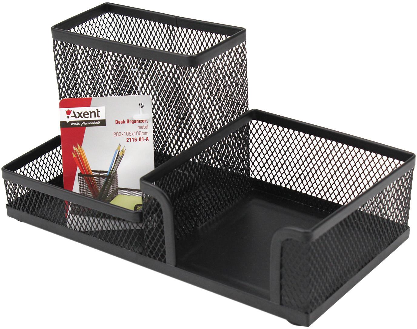 Порядок на столі - порядок у справах. Підставка-органайзер Axent - ще один офісний аксесуар, щоб підтримувати порядок на робочому столі - дозволяє естетично і зручно розмістити паперові блоки і канцелярське приладдя. Складається з 3-х відділень. Підставка-органайзер з металевої сітки органічно і "невагомо" виглядає на будь-якому робочому столі. Міцний матеріал, якісне фарбування і обробка країв, суцільнометалеве дно забезпечують акуратний зовнішній вигляд протягом довгого часу. Підставка-органайзер з металевої сітки може стати доповненням до інших настільних аксесуарів Axent з цієї серії.