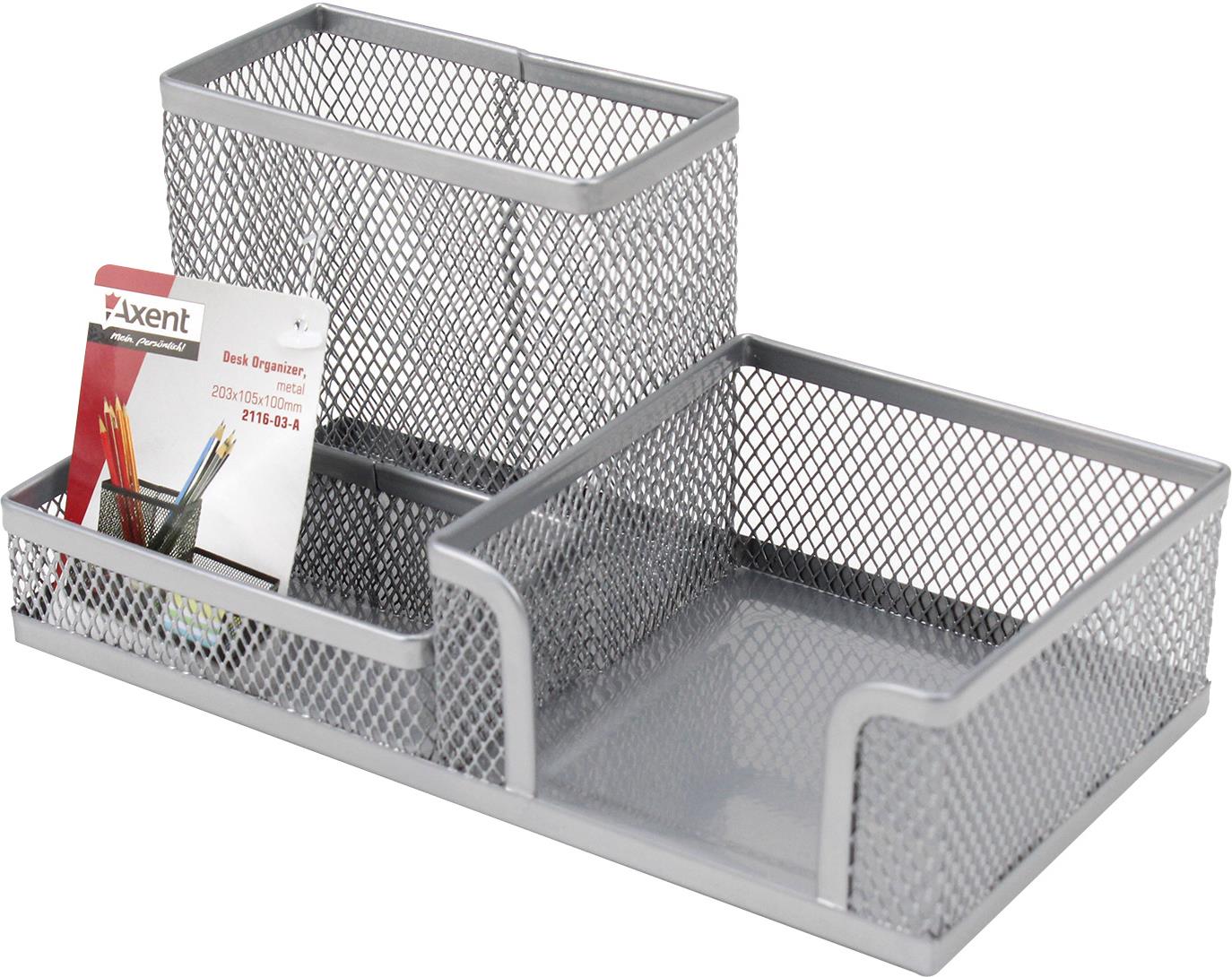 Порядок на столі - порядок у справах. Підставка-органайзер Axent - ще один офісний аксесуар, щоб підтримувати порядок на робочому столі - дозволяє естетично і зручно розмістити паперові блоки і канцелярське приладдя. Складається з 3-х відділень. Підставка-органайзер з металевої сітки органічно і "невагомо" виглядає на будь-якому робочому столі. Міцний матеріал, якісне фарбування і обробка країв, суцільнометалеве дно забезпечують акуратний зовнішній вигляд протягом довгого часу. Підставка-органайзер з металевої сітки може стати доповненням до інших настільних аксесуарів Axent з цієї серії.