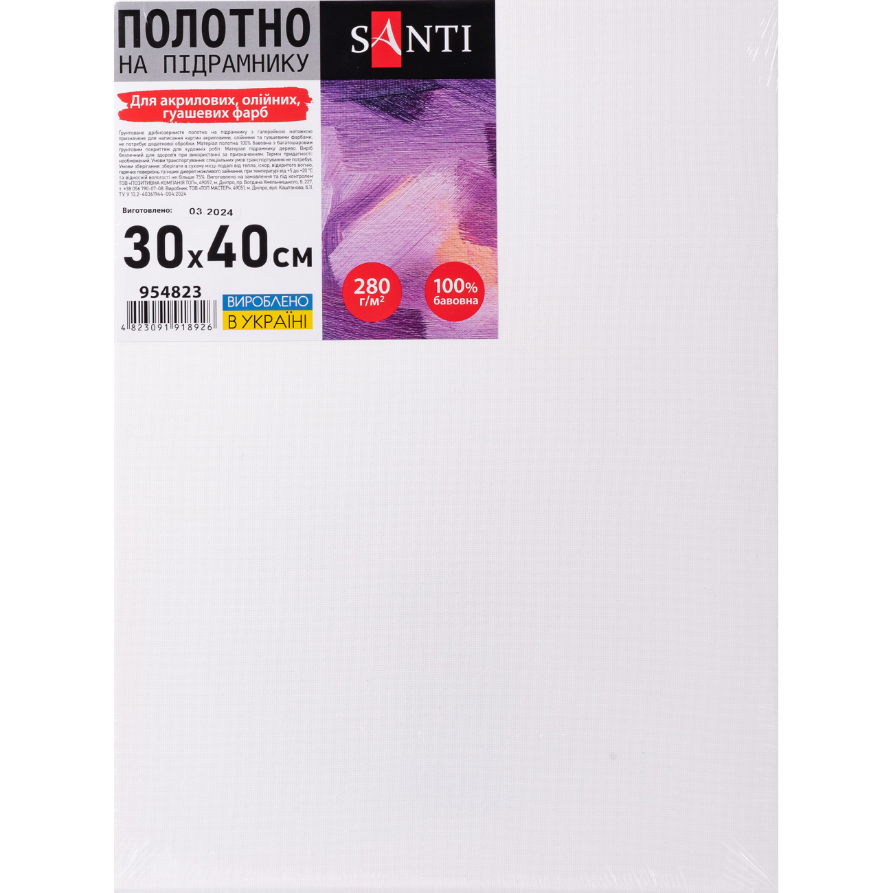 Полотно на підрамнику ТМ SANTI – це незамінна річ в художній діяльності, яка є основою для майбутніх шедеврів. Полотно на підрамнику ТМ SANTI можуть використовувати як художники-професіонали, так і початківці. Полотно на підрамнику ТМ SANTI повністю підготовлено до роботи, має галерейну натяжку та багатошарове ґрунтове покриття. Полотно на підрамнику ТМ SANTI призначене для написання картин акриловими, олійними та гуашевими фарбами. Дрібнозернисте полотно добре утримує фарбу, не вбираючи її, та зберігає природний тон та блиск фарби. Багатошарова ґрунтовка забезпечує ідеальну поверхню для нанесення фарби в різних техніках. Картини написані на полотні на підрамнику зручно зберігати, легко переносити та підвішувати. Технічні характеристики полотна на підрамнику ТМ SANTI: - розмір полотна на підрамнику: 30 х 40 см; - щільність полотна: дрібнозернисте, 280 г/м2; - матеріал полотна: 100% бавовна з багатошаровим ґрунтовим покриттям для художніх робіт; - матеріал підрамнику: дерево; - галерейна натяжка; - колір: білий. Придбавши продукцію для творчості ТМ SANTI ви зможете з легкістю втілити свої творчі ідеї в реальність.