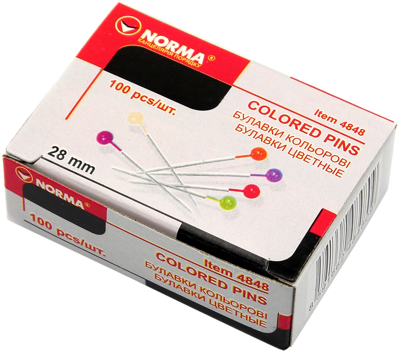 Металеві шпильки Norma, нікельовані з кольоровою пластиковою голівкою. Довжина 28мм. Упаковані в картону упаковку по 100 шт.