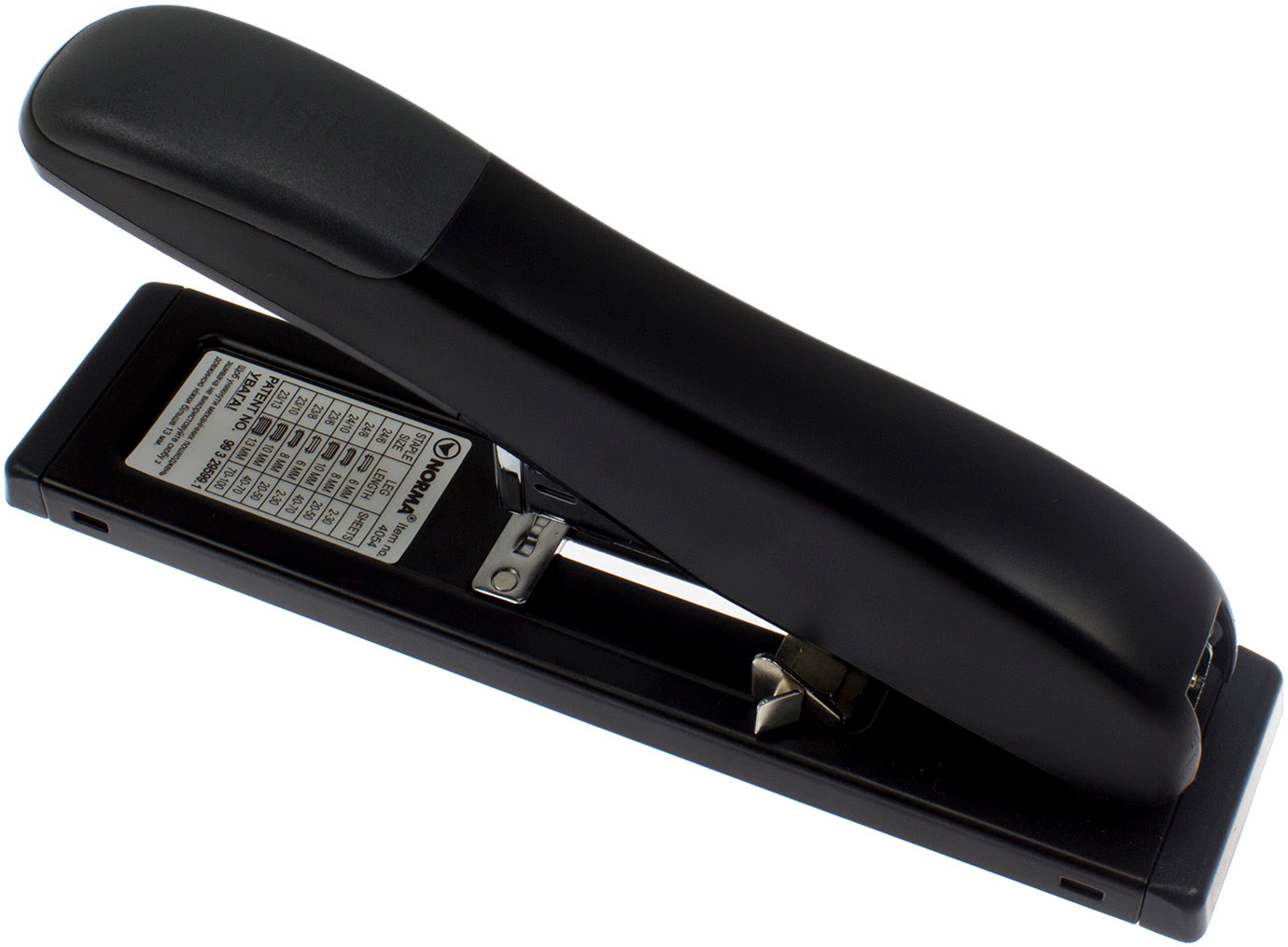 Міцний високопотужний степлер Norma, підходить для щоденного використання при роботі з великим об'ємом документів. Корпус степлера виготовлений з якісного ударостійкого ABS-пластика з прогумованими вставками. Робочі механізми степлера виконані з металу. Віконце контролю наявності скоби. Пересувна лінійка- дозволяє регулювати глибину завантаження паперу і точно визначити місце скріплення. Довідкова таблиця відповідності номера скоби і к-сті скріплювальних аркушів. Скоба №23/8-13. Скріплює до 100 аркушів. Глибина зшивання 79мм. Тип зшивання: закритий.