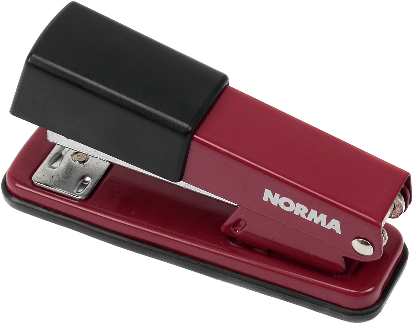 Корпус і робочі механізми степлера Norma виготовлені з металу. Прорезинена антиковзаюча підошва. Ергономічна пластикова накладка на ручці. Віконце контролю наявності скоби. Скоба №24/6-26/6. Скріплює до 20 аркушів. Глибина зшивання 50мм. Тип зшивання: закритий, відкритий. Колір червоний.
