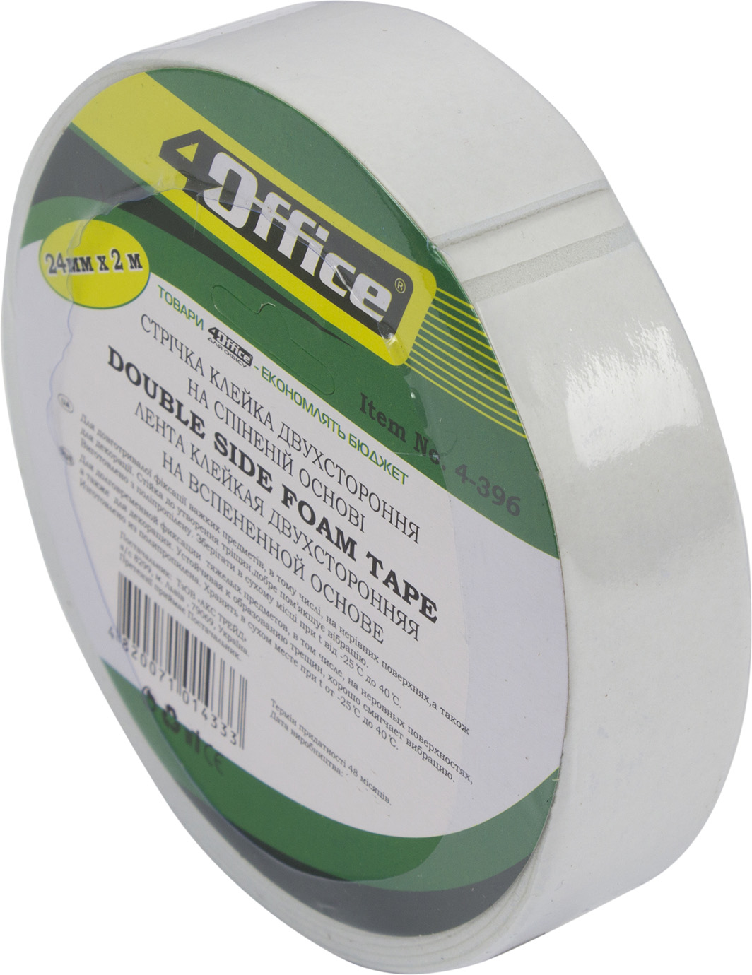 Двостороння клейка стрічка 4Office. На білій спіненій синтетичній основі. Товщина 1мм. Картонна втулка. Індивідуальна упаковка. Розмір: 24ммх2м