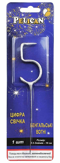 Свічка в торт бенг-ка "Цифра-5" срібло №860025/Pelican/(1)(24)(288)